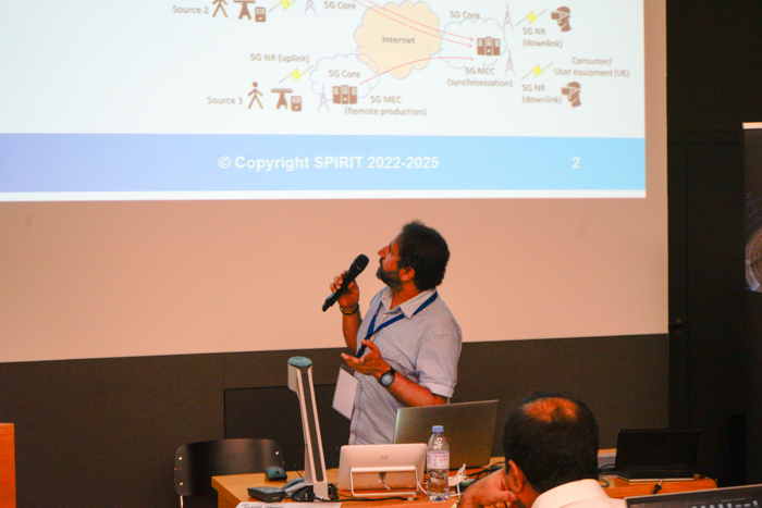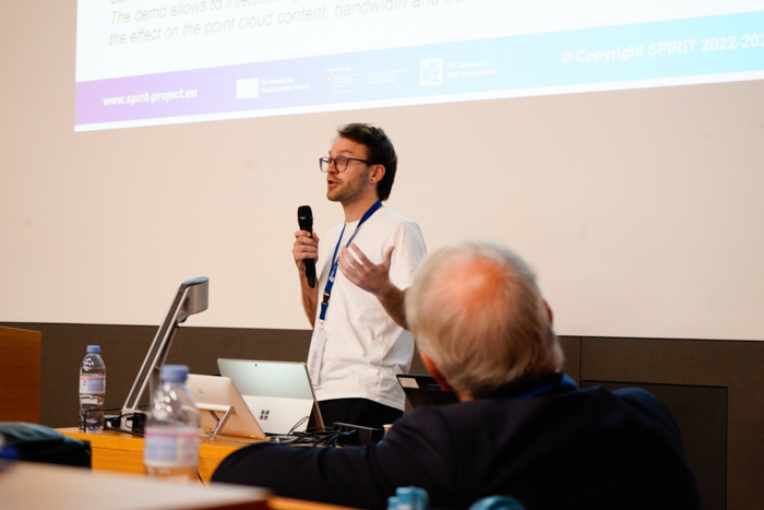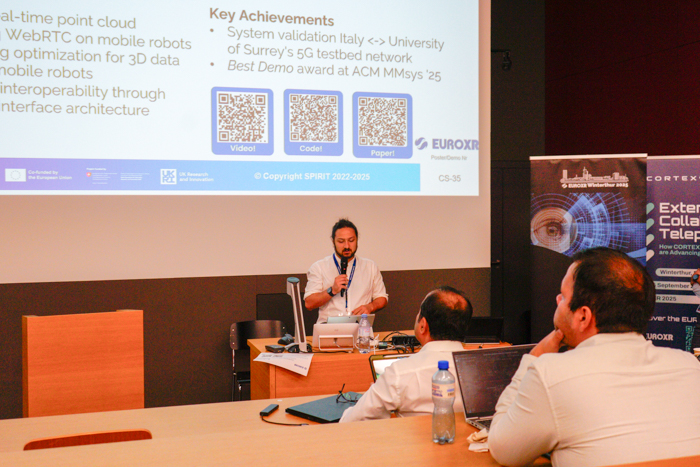 Day 2 continued with presentations of CORTEX² pilot demonstrators and SPIRIT use cases: Avatars, Holographic Communication, Live Volumetric Video Streaming from Multiple Sources, and Distributed Steering of Autonomous Mobile Robots (AMR). The fast-track pitches from Groups 3, 4 & 5 followed. These focused on XR Training for the Manufacturing Domain and Robot Tele-Operation, Health, Entertainment, and Social XR applications, and other XR applications. After the closing remarks from the coordinators of the two projects, poster and demo sessions brought participants face-to-face with SPIRIT and CORTEX² innovations.