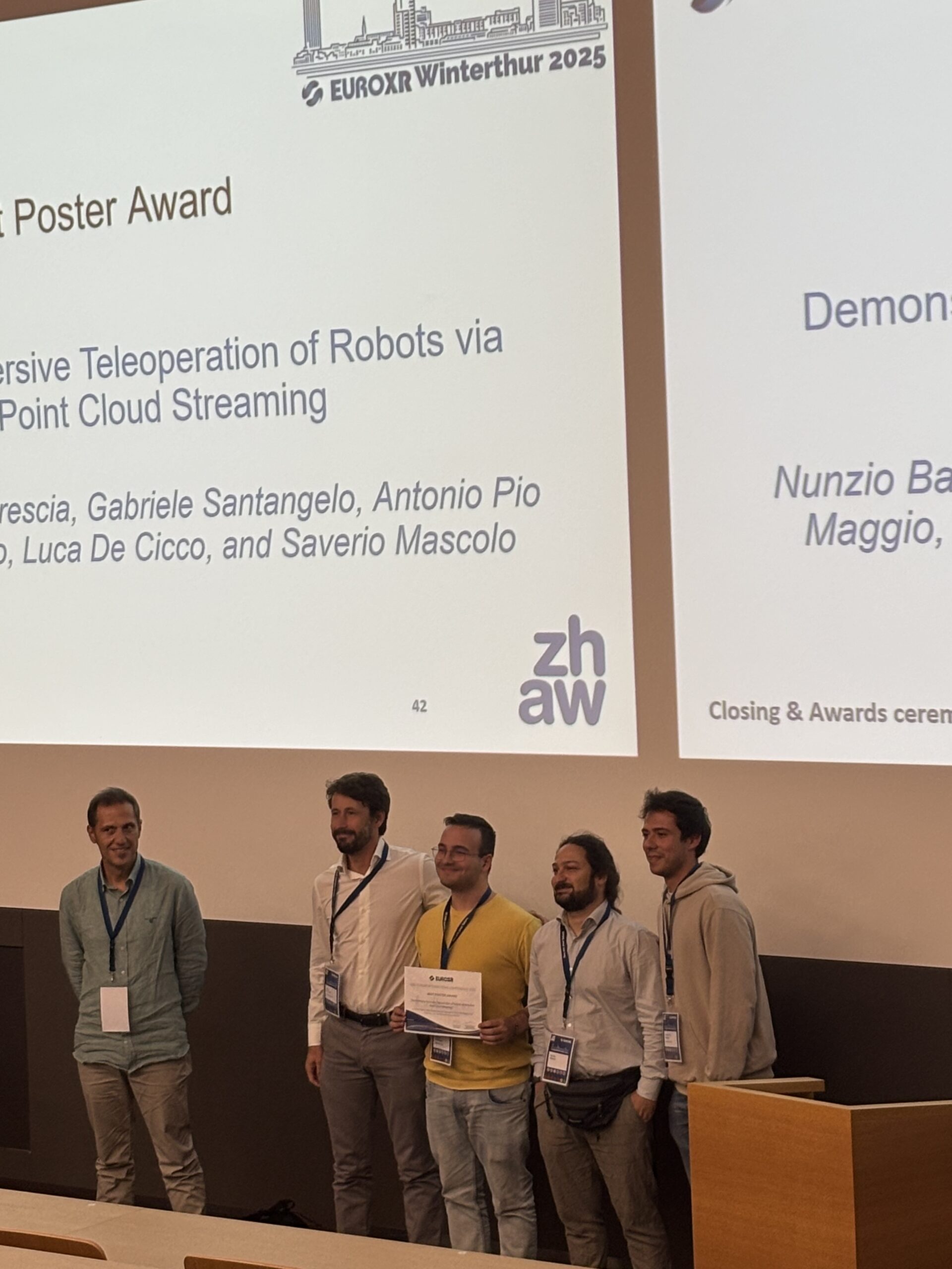 The event concluded with its Closing and Awards Ceremony, marking the end of three inspiring days of collaboration, innovation, and knowledge exchange. The SPIRIT Open Call 1 project DIANE was awarded the Best Poster Award for their poster “Demonstrating Immersive Teleoperation of Robots via Adaptive Point Cloud Streaming” by Nunzio Barone, Walter Brescia, Gabriele Santangelo, Antonio Pio Maggio, Ivan Cisternino, Luca De Cicco, and Saverio Mascolo.
